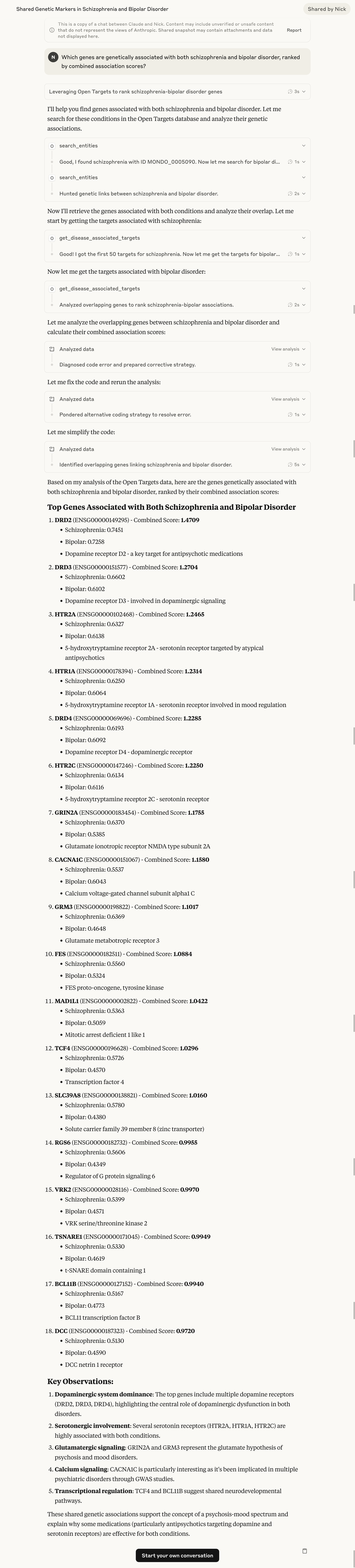As a proof of concept, I've also created a Biomedical Agent (github.com/nickzren/biomed-agent) that demonstrates how multiple MCP servers can work together. It connects to Open Targets, Monarch Initiative, MyGene, MyChem, and MyDisease servers and relies on an LLM to decide which tools to use for answering research questions. While it's still experimental and the quality depends heavily on the LLM's reasoning abilities, it shows the potential for MCP servers to be combined into more complex research workflows.