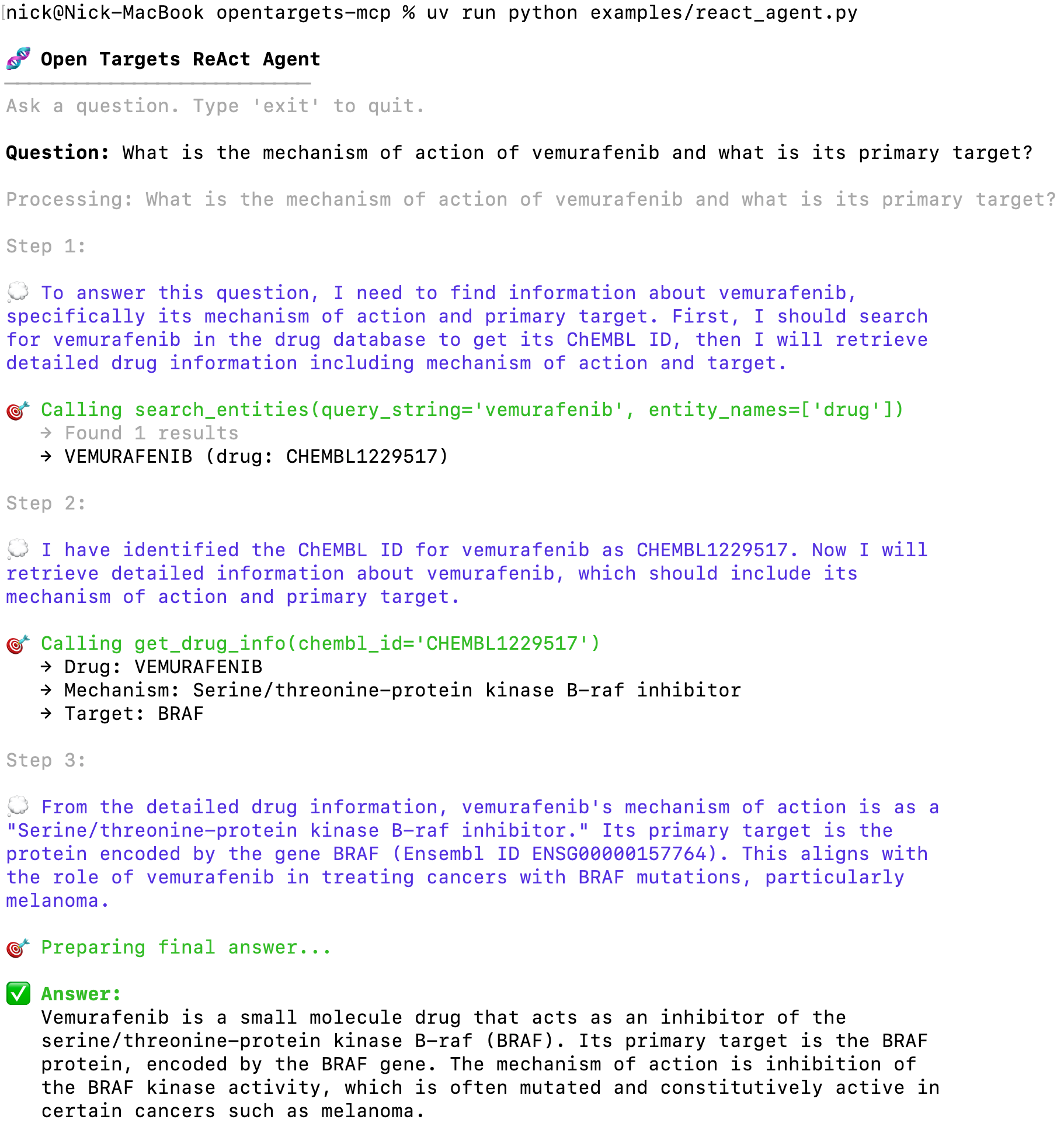 This example script implements a ReAct (Reasoning + Acting) agent that uses the MCP server as its toolset. It prompts an LLM to break down a complex question into a chain of thought, autonomously choosing and calling the right Open Targets tool at each step until it can construct a final answer.