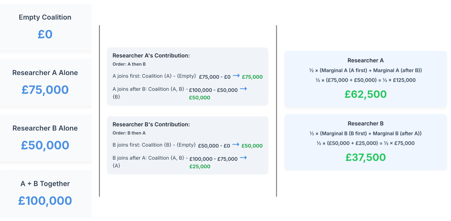 Imagine two researchers collaborating on a grant application. Working alone, Researcher A could secure £75,000, while Researcher B could obtain £50,000. Together, they obtain £100,000. How should they split this funding fairly?