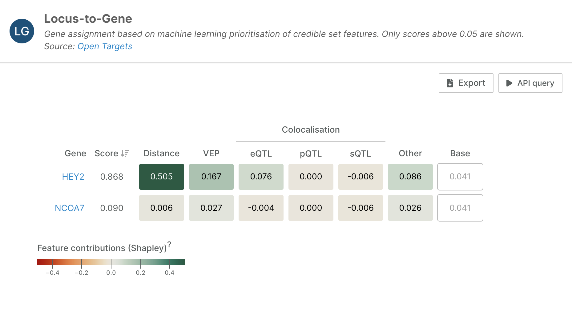 We recognised that this interpretability challenge could be addressed by leveraging machine learning explainability algorithms. Specifically, we have implemented Shapley value-based explanations for L2G scores. This transforms our L2G widget from a simple score display into an interpretable analysis tool that reveals how each piece of functional evidence contributes to the final prediction.