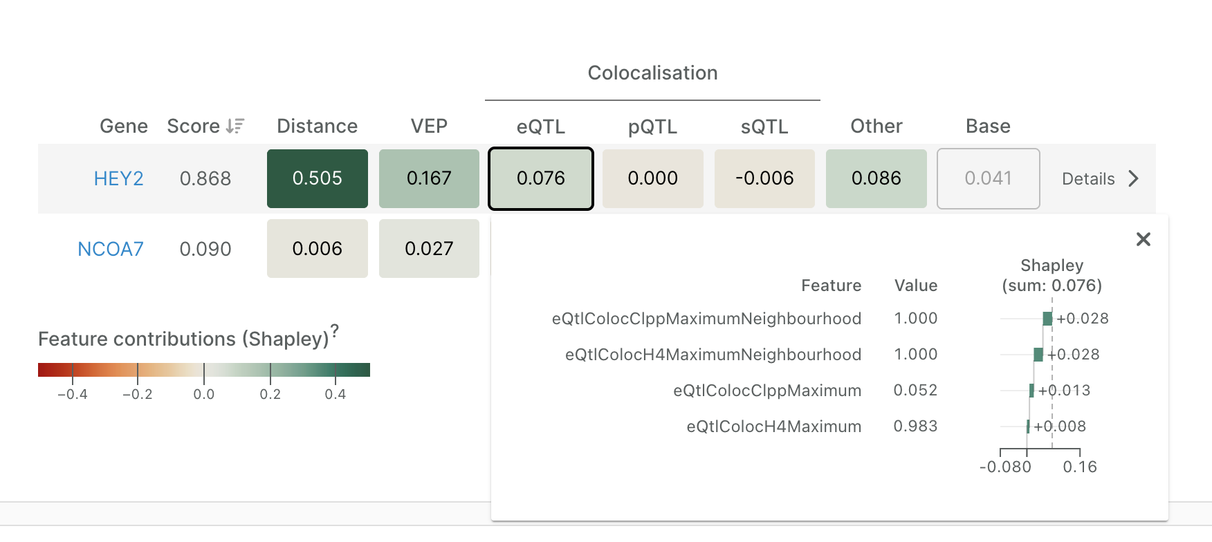 Clicking on any feature group reveals individual feature contributions. For instance, expanding the eQTL group for HEY2 shows that several colocalisation-derived features jointly contribute +0.076 to the gene’s overall prediction score. These positive SHAP values indicate that strong eQTL colocalisation evidence increases the model’s confidence that HEY2 is the likely causal gene at this locus. To provide context, we have also included the value of each feature as it is incorporated into the model. In this example, the maximum colocalisation posterior probability (H4) is 0.983, indicating strong support for a shared causal variant between the GWAS and eQTL signals.