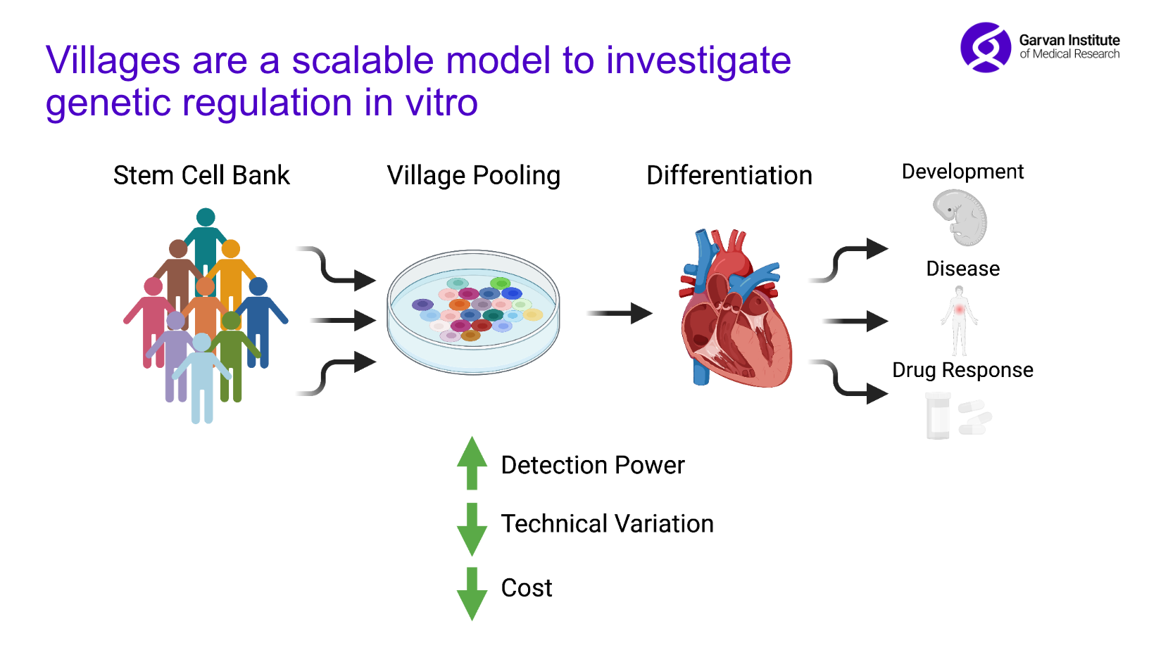 To study genetic regulation in vitro, the Powell lab employs “stem cell village models”, in which hundreds of stem cell lines collected from different donors are pooled and cultured together. The village model enables us to run hundreds of experiments simultaneously, empowering us to explore how genetic differences may drive patient-specific differences in development or in responses to medicines.