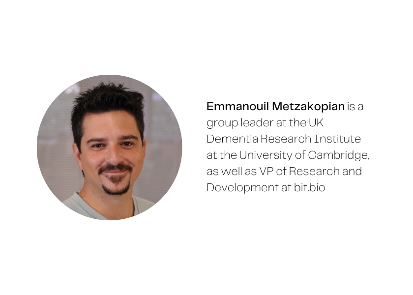 Emmanouil Metzakopian is a group leader at the UK Dementia Research Institute at the University of Cambridge, as well as VP of Research and Development at bit.bio. He leads a number of neuroscience projects at Open Targets, one of which recently published a genetic screen aimed at finding genes whose inhibition could protect neurons against cell stress [1].