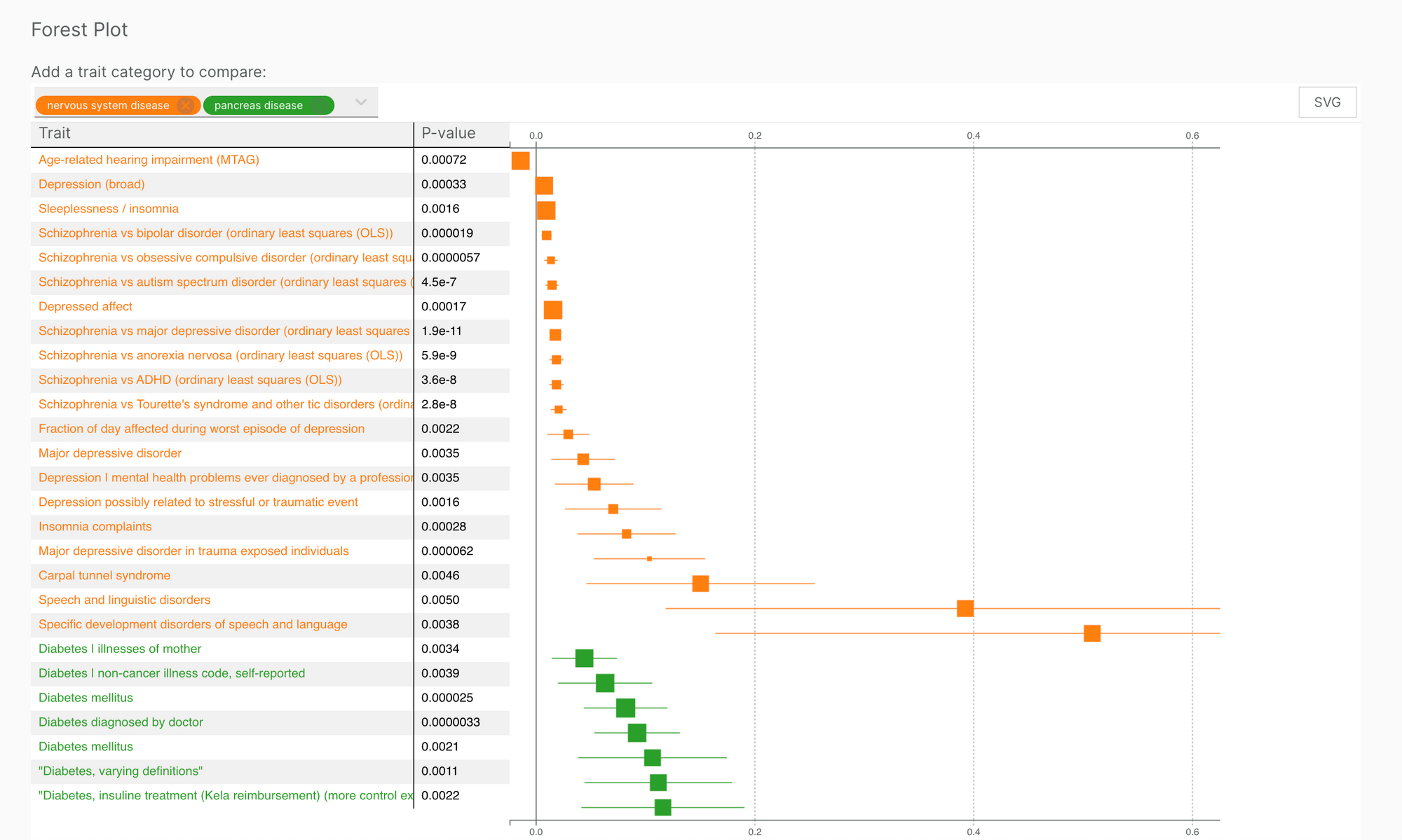 The forest plot enables users to filter and cross-compare the effect sizes of multiple trait categories associated with a given variant. This information complements the PheWAS plot to better understand the phenotypic effect of a given variant across studies.