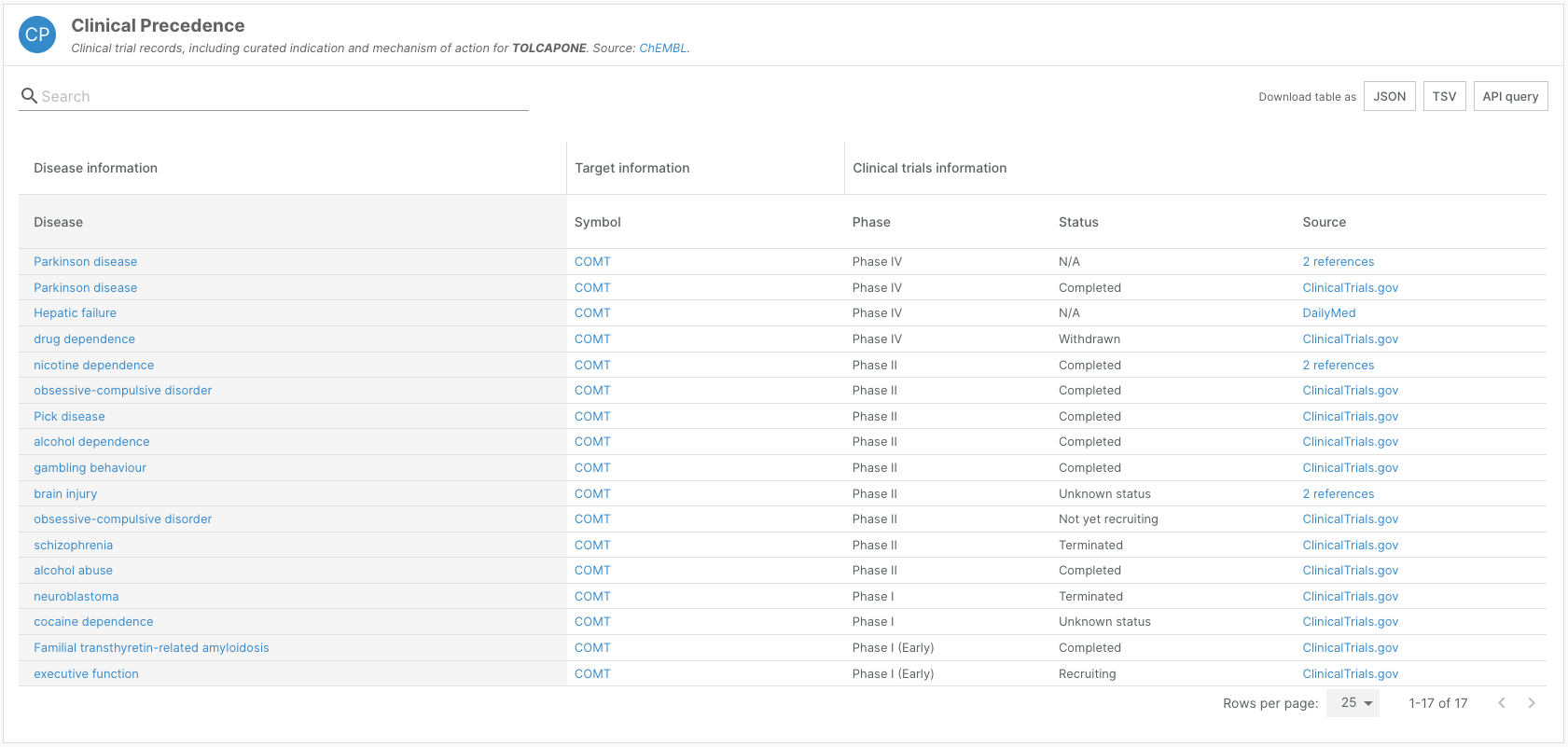Widgets showcasing drug information — such as the ChEMBL widget on target-disease evidence pages, the Known Drugs widget on disease profile pages, and Clinical Precedence and Indication widgets on drug profile pages — now reflect the clinical development stages as defined by ChEMBL.