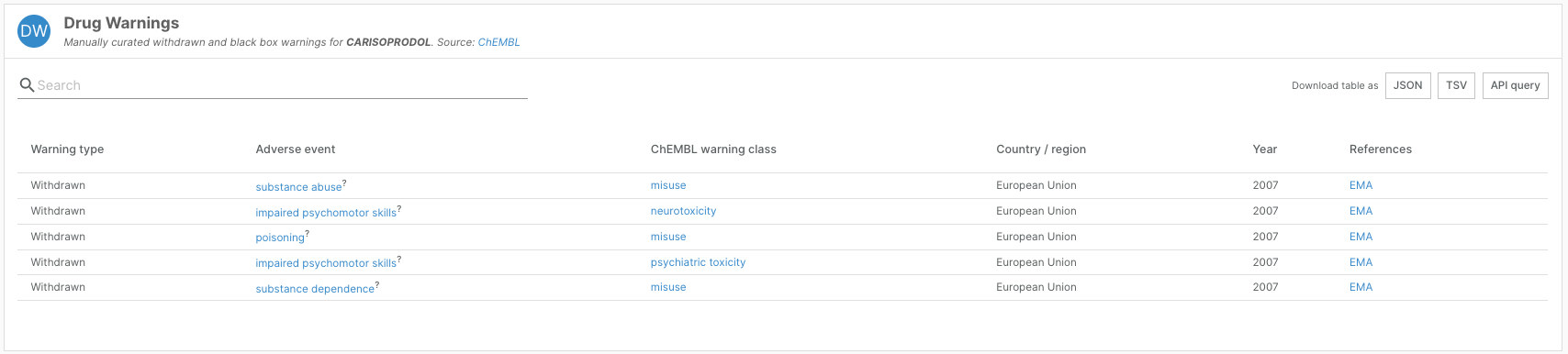This information can be viewed as a new “Adverse Event” column in the Drug Warnings widget on drug profile pages.