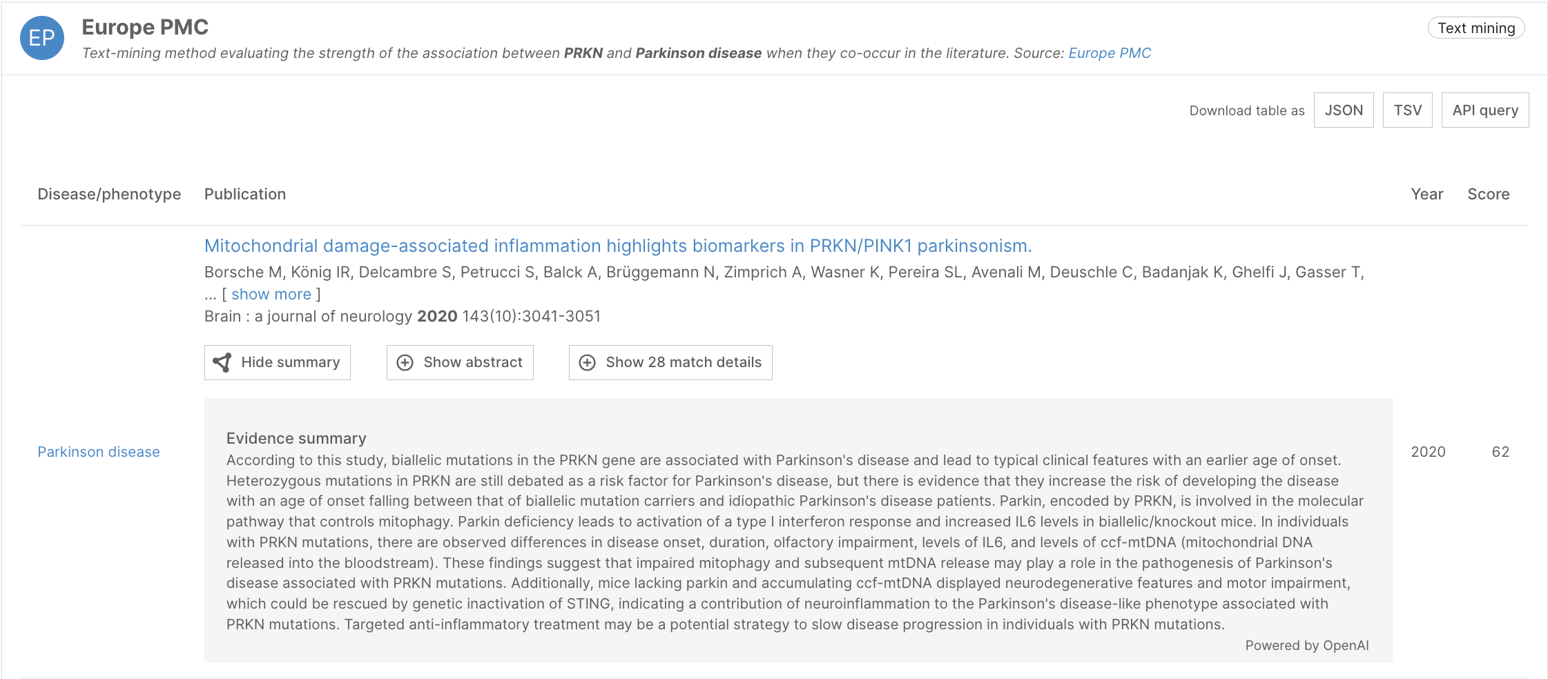 For data features that link to publications, the Platform now provides the option for users to ask for a natural language summary of the target-disease evidence presented in the publication (when the full-text article is available and free to re-use).