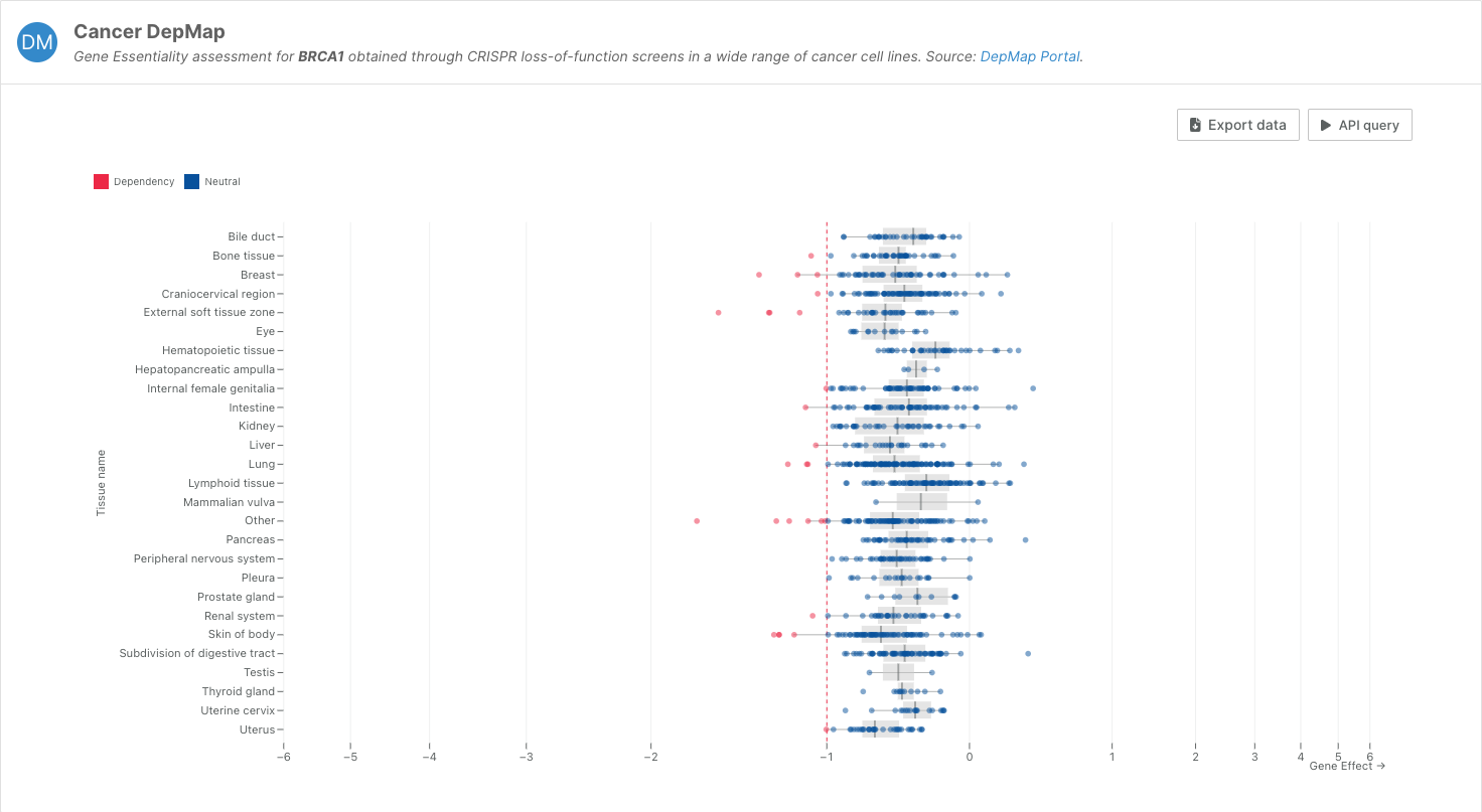 The Cancer DepMap widget displays data from the DepMap portal, showing a gene essentiality assessment obtained through CRISPR loss-of-function screens in a wide range of cancer cell lines. Although in cancer, this experiment represents a good proxy of whether loss-of-functions are tolerated across a diverse set of tissues.