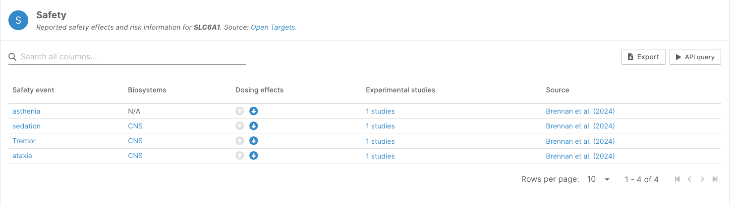 One example is SLC6A1, a target with genetic data and a drug approved for epilepsy. The inhibition of this transporter increases GABA levels in the brain, and the safety events are derived from the same effects. SLC6A1 is an interesting example of relative severity: as an antiepileptic, the benefit of reducing seizures outweighs the side effects, but for anxiety, this cost-benefit analysis is less certain.