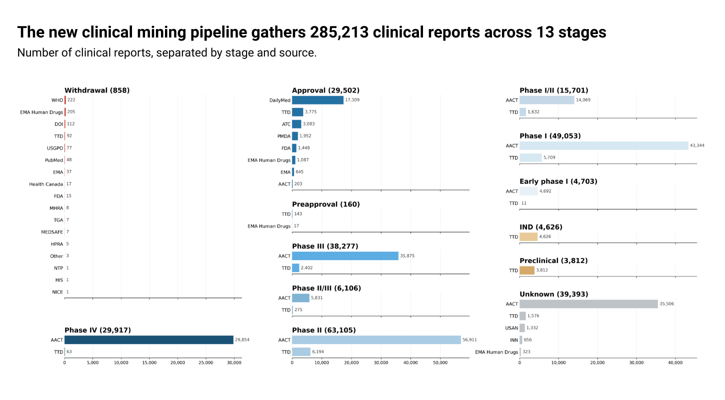 We have implemented a new clinical mining pipeline which expands the data sources for clinical information. Our revamped pipeline fetches, processes, and annotates data from:
