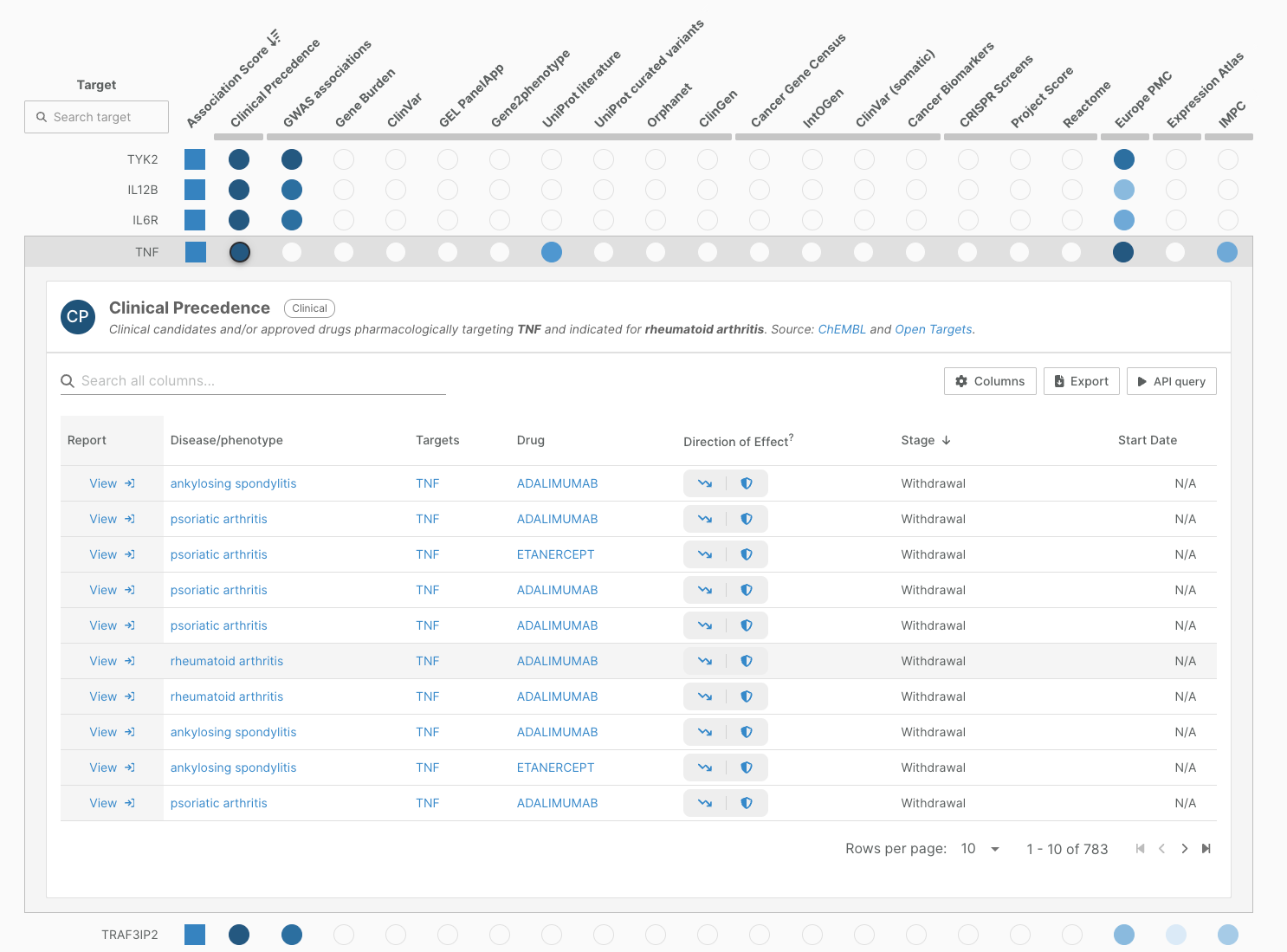 We have also moved this column into the first position of the associations view, as user feedback indicated this was a key starting point in prioritisation workflows for understanding whether a target or an indication is or has ever been investigated clinically.
