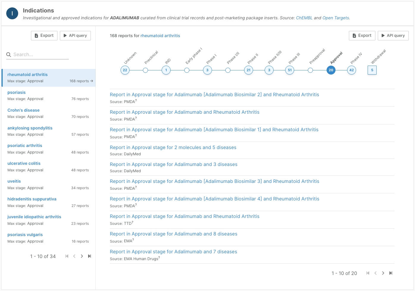 On entity profile pages, we have redesigned the indications widget to aggregate reports by indication (drug pages) or drug (target and disease pages, target prioritisation).