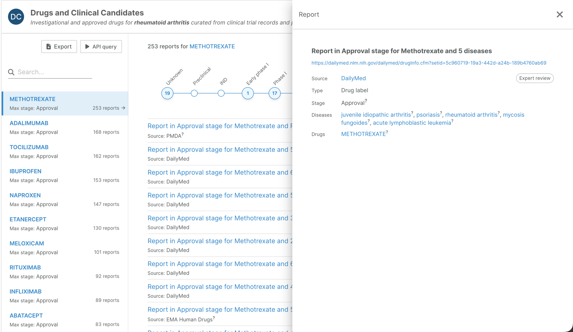 The widget now clearly shows for each indication whether the drug has been approved, and if not, the highest clinical stage reached. We have also been able to add additional nuance to the clinical stages.