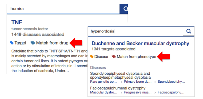 Note the tags "match from drug" or "match from phenotype" in the results of your search.
