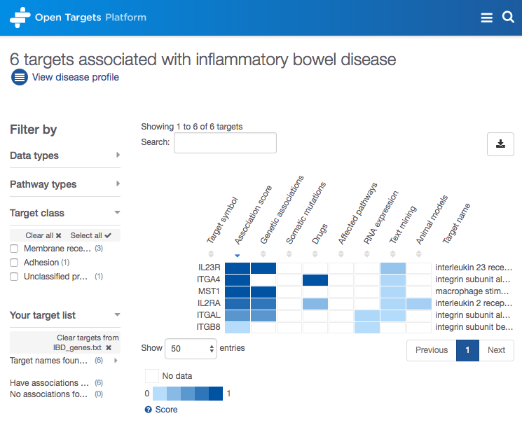 You can now upload a list of target names (e.g. IL23R, ITGA4) or Ensembl IDs (e.g. ENSG00000162594, ENSG00000115232) for a disease of interest (e.g. inflammatory bowel disease) and get the association scores and the evidence for the association.