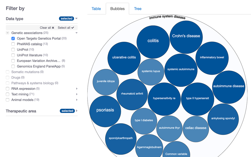 One of the effects of the new approach is that we can now assign multiple genes as potentially causal at each trait associated region. Hence, you'll notice a massive increase in the number of targets associated with these complex diseases! For example, we now assign 3014 targets associated with Crohn's disease, whereas in the previous release we only had 389 targets associated with Crohn's.