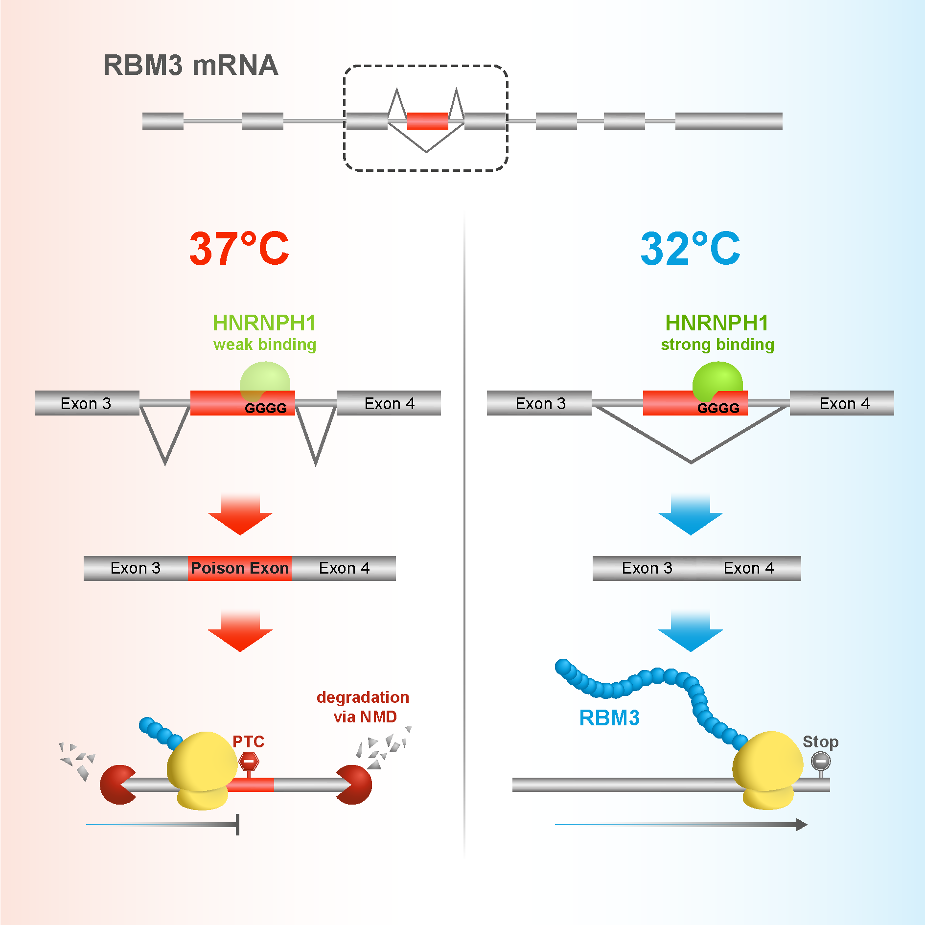 Deepak. It’s also a rapid response method of regulation. It might seem like a waste for a cell to transcribe a gene only for that transcript to be destroyed by a poison exon, but it’s quite clever — it means that the cell can respond very quickly when there is a change in the environment. So as soon as the cell senses that the temperature is dropping, RBM3 can be active to protect the cell.